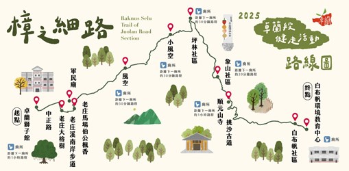 (三) 活動路線:獅子館(起站)→中正路→老庄大榕樹(中角伯公)→老庄溪南岸步道→老庄馬場伯公→軍民廟→風空→小風空→坪林社區→象山社區→順元山寺→挑沙古道→舊苗58縣道→白布帆社區→白布帆環境教育中心(終站),全程約16.8公里。