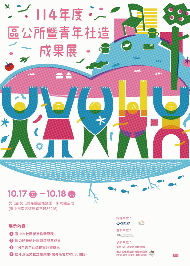 「114年度區公所暨青年社造成果展」訂於114年10月17日至10月18日假文化部文化資產園區衡道堂多功能空間辦理,歡迎蒞臨參觀。