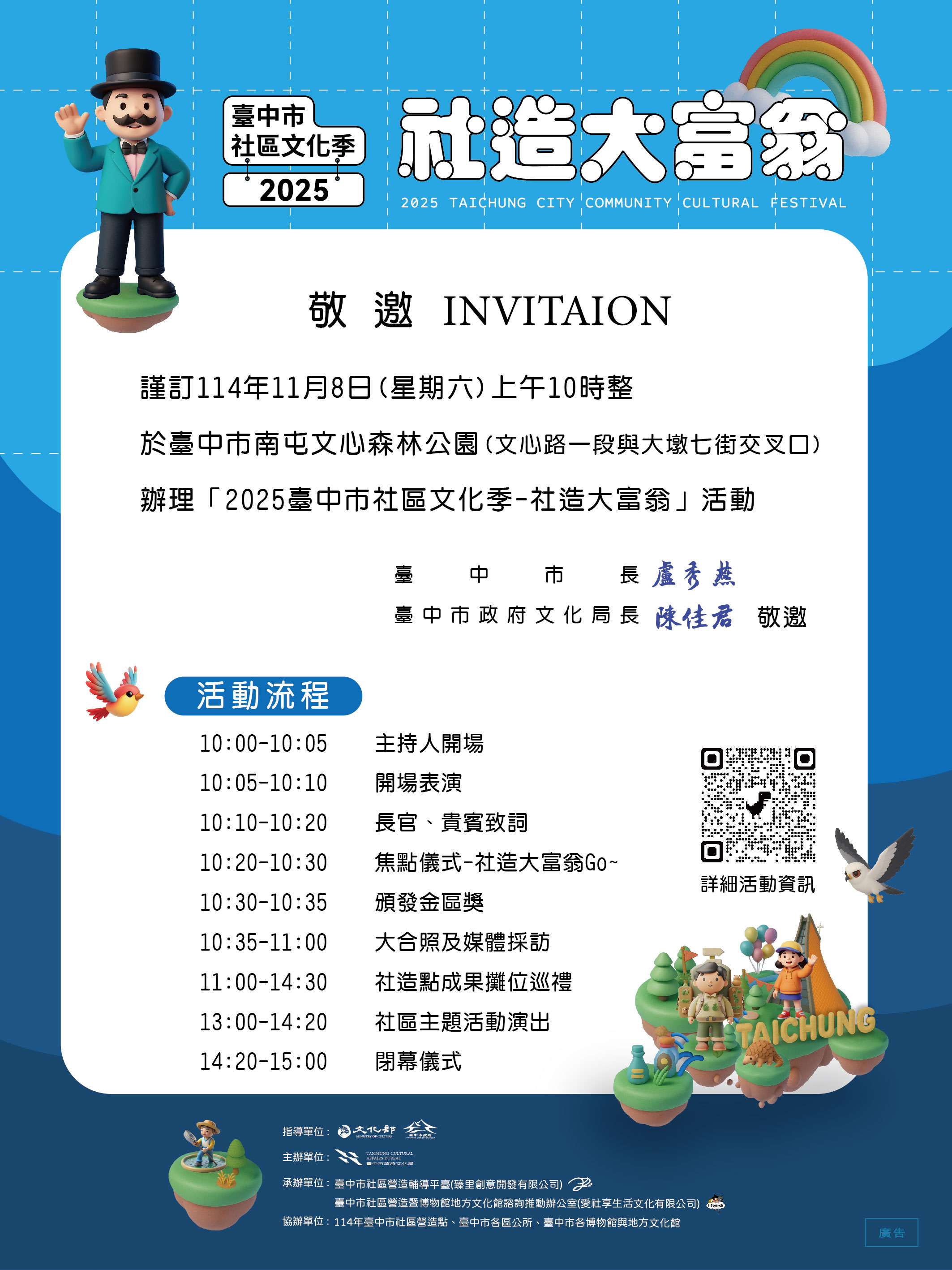 臺中市政府文化局為展現臺中市社區營造成果,串聯114年度社造點、各區公所、社區大學等,共同呈現社區的主題特色,於本市文心森林公園南側溜冰場(文心路一段與大墩七街交叉口)上午10時至15時舉行,歡迎踴躍參加。詳情請參見活動專頁(https://community.culture.taichung.gov.tw/culture/)。