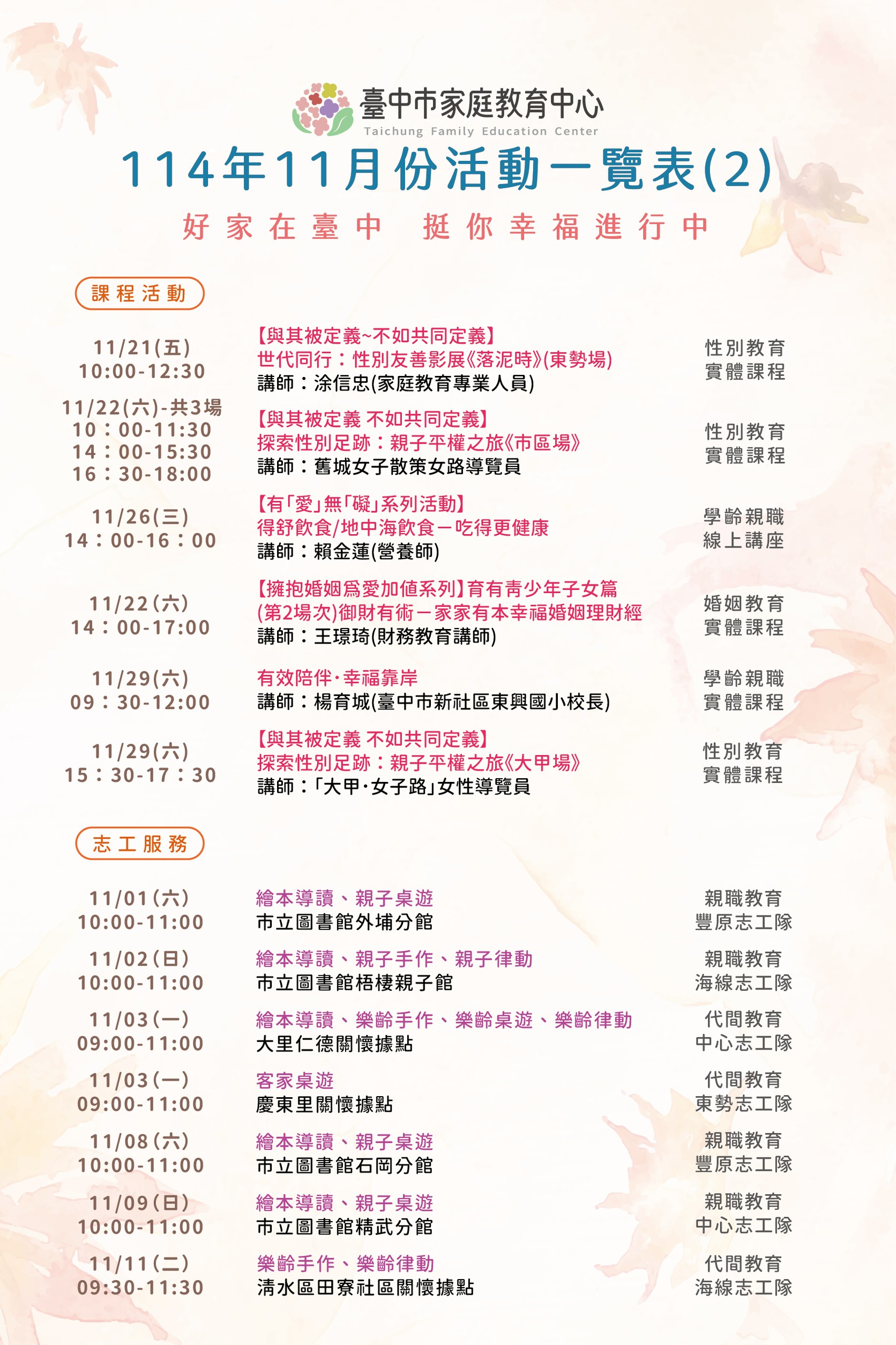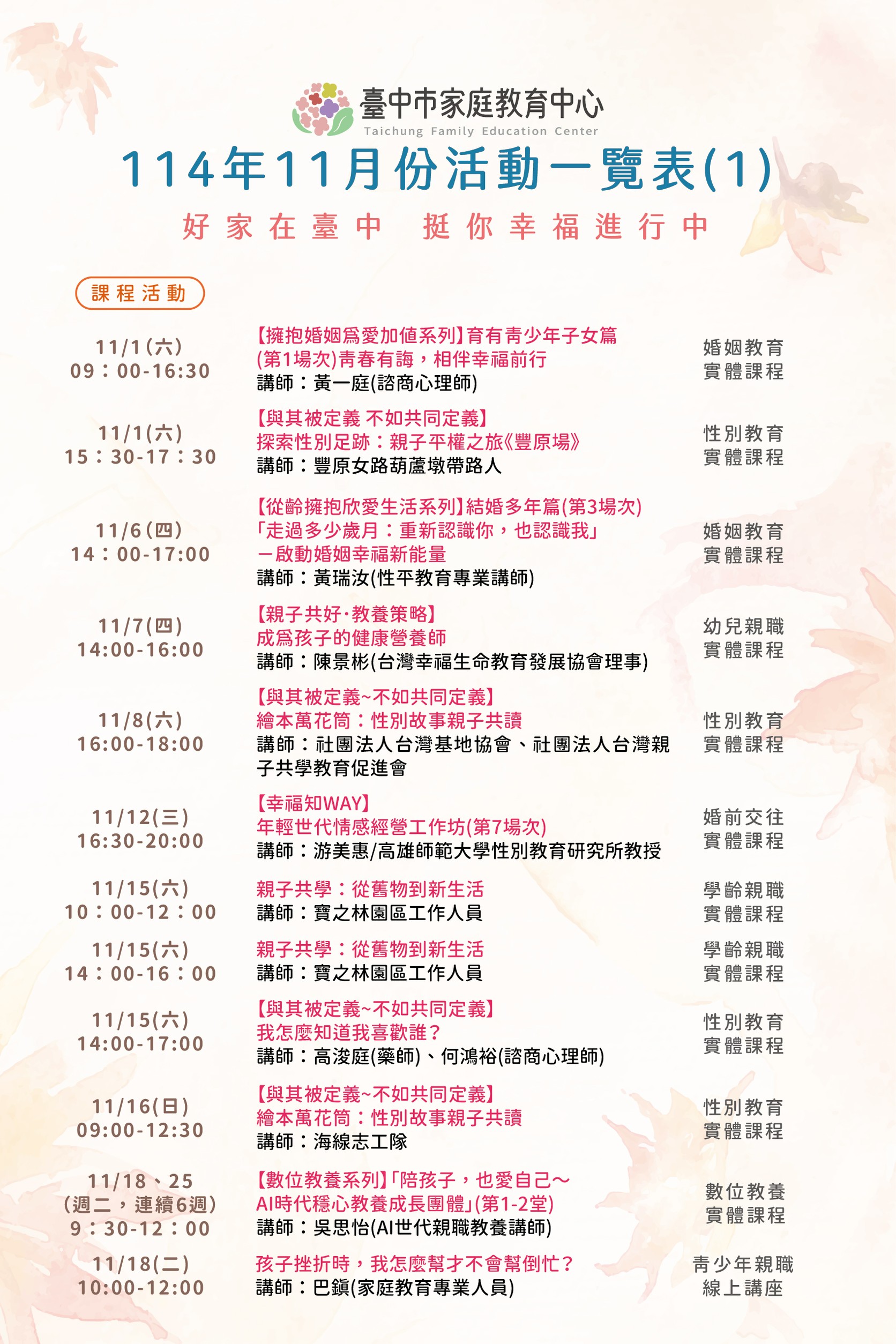 🍁臺中市家庭教育中心邀您一起參與本月精彩多元的課程活動~從親職教育、數位教養婚姻經營、青少年溝通、情緒管理、幼兒教養到到多元型態家庭學習、婚前交往準備等主題應有盡有,讓我們在溫馨互動的氛圍中學習,累積創造幸福、和諧家庭的力量!