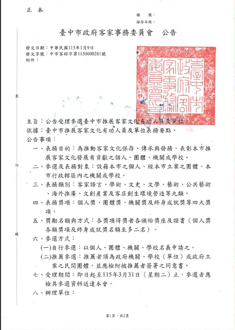 - 受理期間:即日起至115年3月31日(星期二)止,參選者應檢具參選資料送達臺中市政府客家事務委員會。