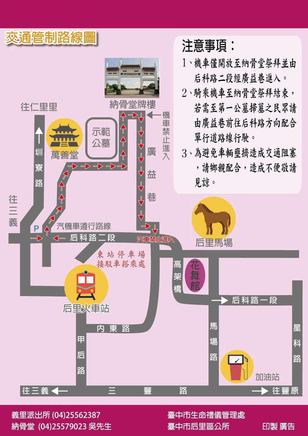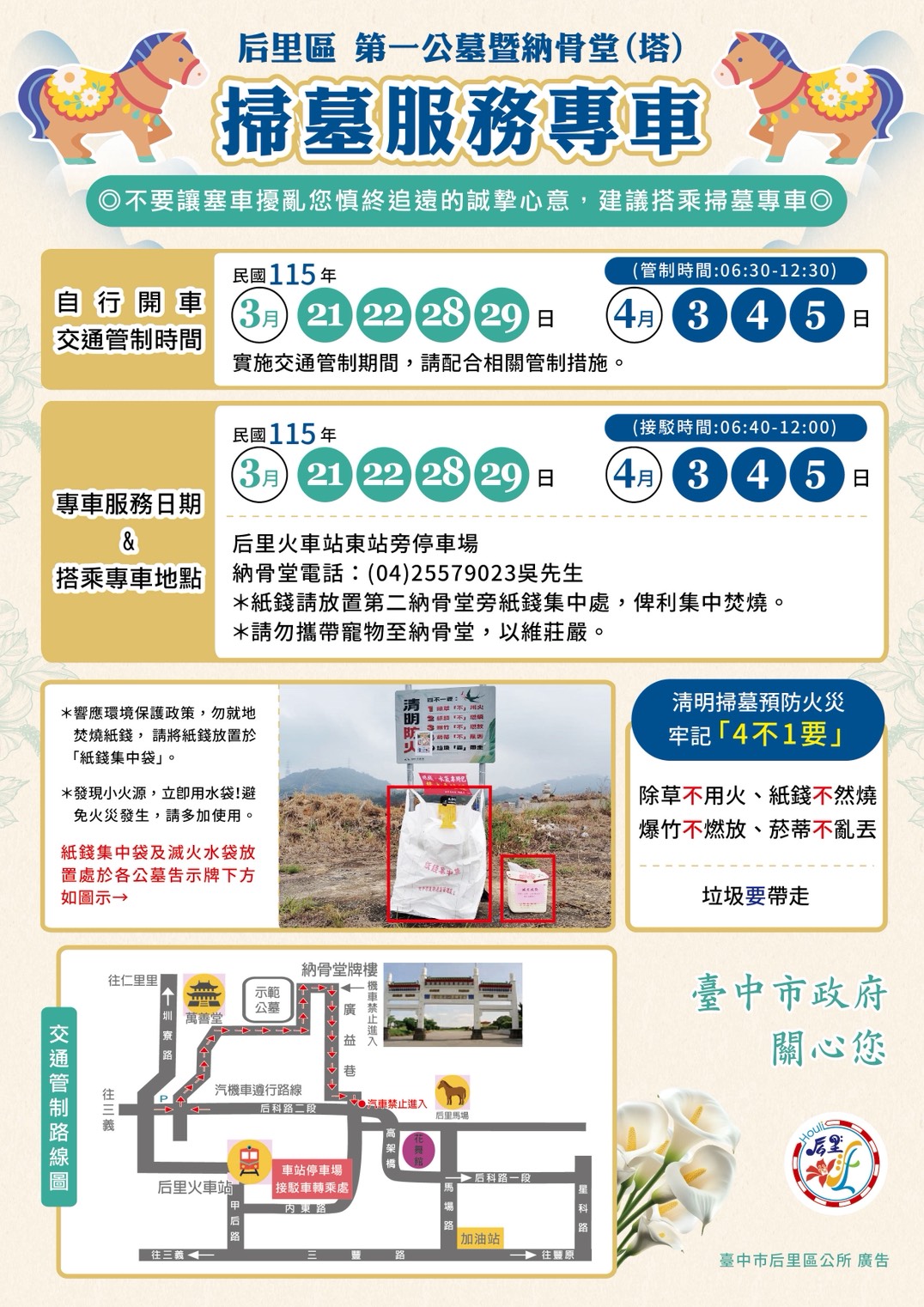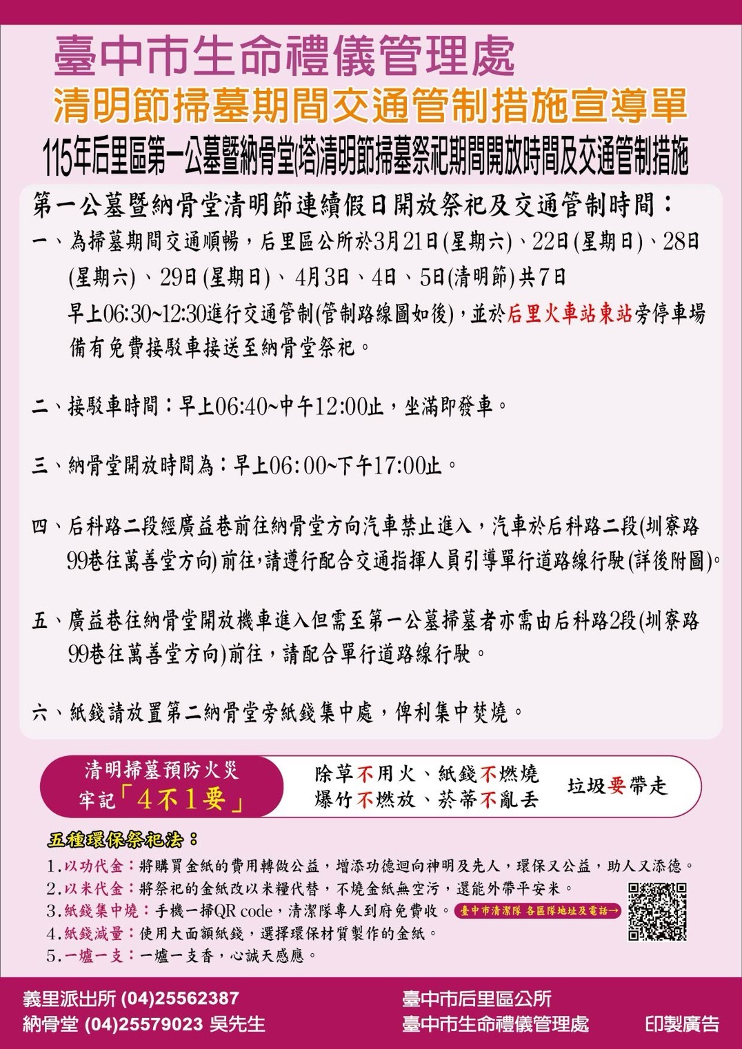 115年后里區第一公墓暨納骨塔清明節掃墓祭祀期間開放時間及交通管制措施宣導