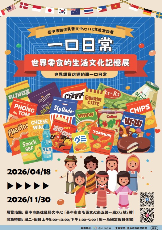 為促進多元文化交流,自本(115)年4月18日起至11月30日止,於本市新住民藝文中心(臺中市南屯區文心南五路一段331號1樓_豐樂雕塑公園內)舉辦以「各國零食」為主題的「一口日常.世界零食的生活文化記憶展」常設展,歡迎蒞臨參觀。